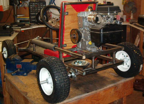 I'm sure a lot if work went into this kart. It looks fairly chunky with them bigfoot wheels. (off a golf kart I think) This kart is well finished. I have to say that my karts when I finish with them are rough machines. This is well finished and is user friendly. A nice roll cage would finish off that type of kart to a "T" making it look invincible.